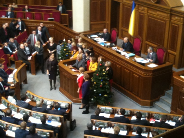 Женщины-народные депутаты заблокировали трибуну в знак протеста против нарушения прав женщин Украины и заключенного экс-премьера Юлии Тимошенко в частности.