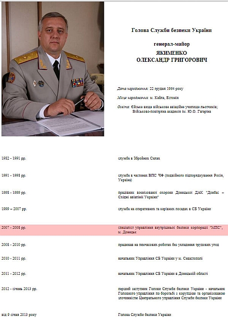«В 2007-2008 годах работал специалистом управления внутренней безопасности корпорации «МПС», город Донецк», - говорится в биографии.
