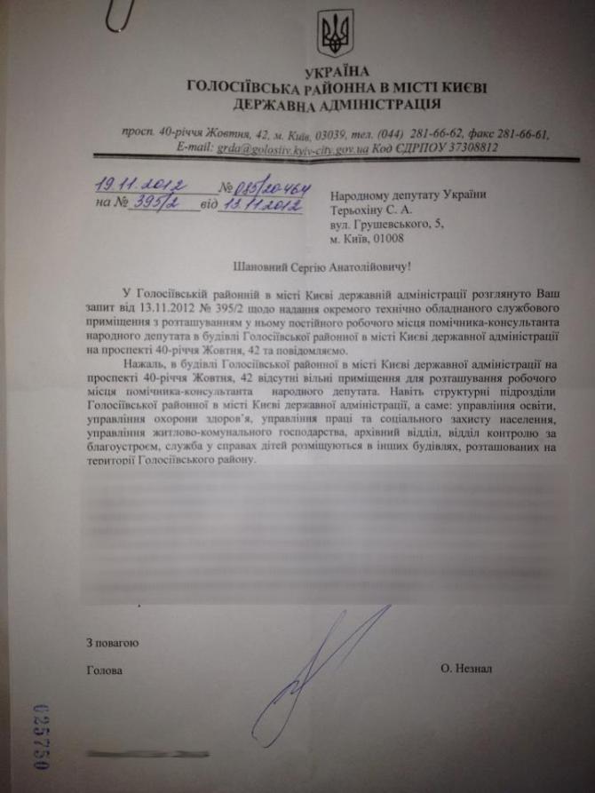 Киевская власть отказала Терехину в помещении для приемной (документ)