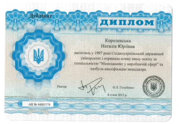 В частности, предоставлена копия диплома, который свидетельствует, что в 1997 году Королевская окончила Восточноукраинский государственный университет и получила полное высшее образование по специальности «Менеджмент в производственной сфере» и получила квалификацию менеджера. На копии диплому указано, что это дубликат и он датирован 8 января 2013 года.