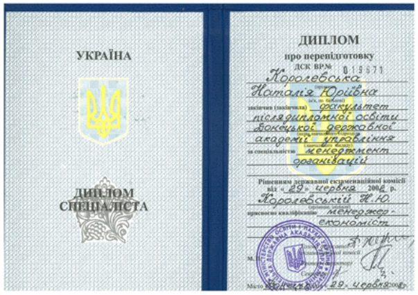 Кроме того, пресс-служба Минсоцполитики предоставила копию диплома специалиста о переподготовке. В соответствии с этим дипломом, Королевская в 2002 году окончила факультет последипломного образования Донецкой государственной академии управления по специальности «Менеджмент организаций» с присвоением квалификации «менеджер-экономист».