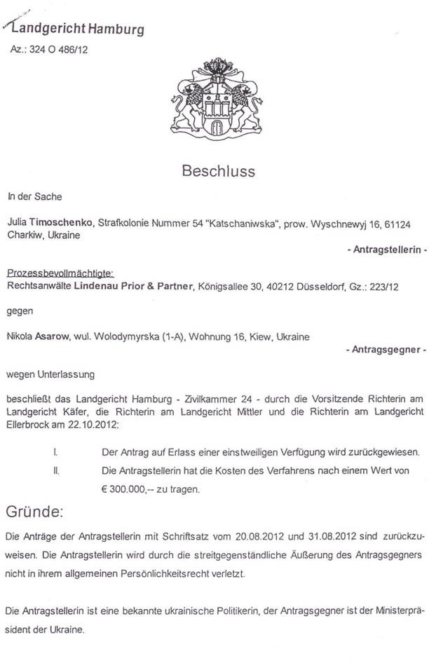 «Решением по делу № 324 О 486/12 судей - председатель Земельного суда Кефер, судьи Митлер и Еленброк - отклонили иск Юлии Тимошенко к Николаю Азарову», - сообщает пресс-служба Кабмина.