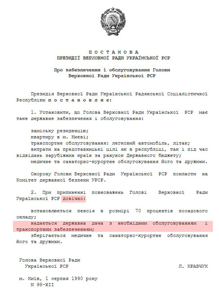 Также на запрос «Украинской правды» Администрация президента предоставила нормативный акт, на основании которого Владимир Литвин не освободил помещение государственной дачи после окончания полномочий спикера. Оказалось, что это постановление президиума Верховного Совета Украинской ССР с гербом несуществующего государства.