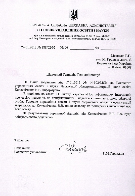 «Очень прошу Колесниченко предоставить письменное согласие Главному управлению образования и науки Черкасской облгосадминистрации на распространение информации о полученном им образовании в средней школе, включая оценки по русскому языку и литературе. Иначе у избирателей может сложиться впечатление, что Колесниченко этих оценок стесняется или же у него в связи с ними возник какой-то комплекс, какой он пытается преодолеть своей нынешней депутатской деятельностью», - подытожил Москаль.