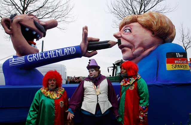 На карнавале, который традиционно высмеивает недобросовестных или неудачливых политиков, досталось и самой Ангеле Меркель, которой грек рисует гитлеровские усы, и сопернику Меркель на грядущих выборах. Организаторы обыграли фамилию кандидата на пост канцлера Пеера Штайнбрюка, изменив в ней одну букву и получив каламбур «тяжесть камня».