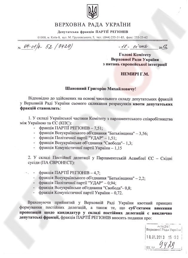 В своем письме на имя главы Комитета Григория Немыри от 18 января 2013 года, которое имеется в распоряжении «Главкома», Ефремов выразил несогласие с предложенной формулой раздела мест в делегации. По комитетскому варианту в расчет брали нефракционных депутатов, коих в Раде официально 27 человек. Плюс общее число парламентариев в формуле – 450, как записано в Конституции. Ефремов, напротив, предложил нефракционных при формировании делегаций не учитывать (ссылаясь на норму регламента), а общим числом депутатов считать – 445. В результате цифры сыграли по-другому, а в силу большего дробного числа после запятой лишний человек перекочевал в квоту Партии регионов. Причем, в обеих делегациях. Потому, по версии Ефремова, ПР сама получила половину в делегациях, а с учетом коммунистов – большинство.