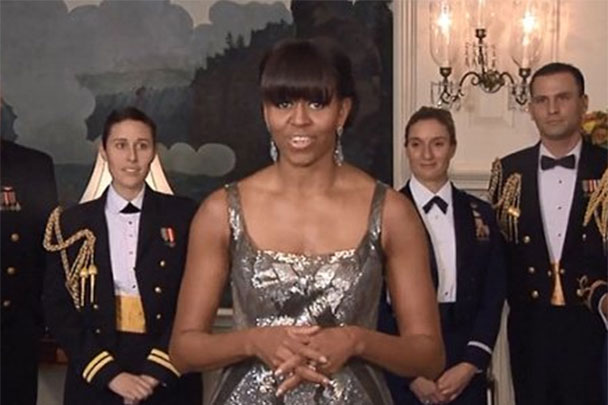 Мишель Обама, появление которой в прямом эфире из Белого дома 24 февраля стало неожиданностью для всех, предстала перед публикой в блестящем сером платье без рукавов, чтобы объявить ленту «Операция «Арго» лучшим фильмом года.