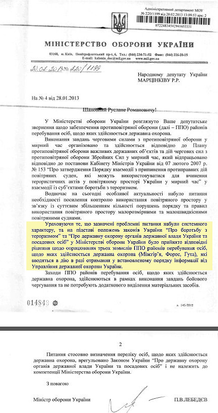 «Учитывая то, что указанные вопросы приобрели системный характер и на основании положений законов Украины «О борьбе с терроризмом» и «О государственной охране органов государственной власти и должностных лиц» в Министерстве обороны были приняты соответствующие решения по разработке трех замыслов ПВО районов пребывания лиц, относительно которых осуществляется государственная охрана (Межигорье, Форос, Гута), которые вводятся в действие в случае получения в установленном порядке информации от Управления государственной охраны Украины», - говорится в ответе на запрос.