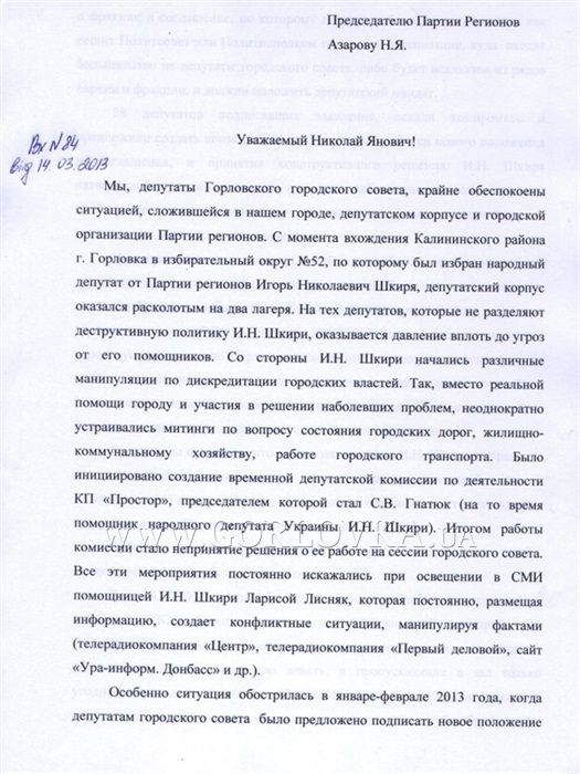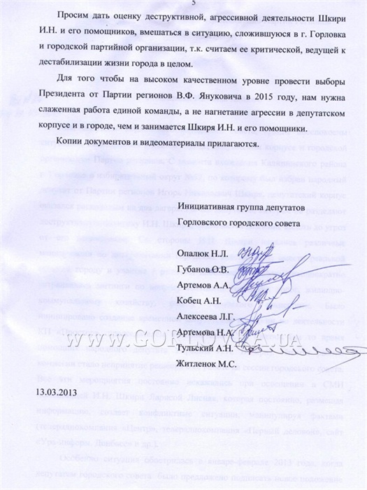 Инициативная группа в составе семи депутатов Горловского горсовета (Донецкая область) обеспокоена ситуацией, сложившейся в депутатском корпусе и городской организации Партии регионов. Чтобы привлечь внимание к Горловке и временному руководителю городских регионалов, нардепу Игорю Шкире, которого обвиняют в «политическом рейдерстве и захвате исполнительной власти», они адресовали обращение верхушке партии, в частности, председателю Партии регионов Николаю Азарову, его заместителю Сергею Тигипко, председателю парламентской фракции ПР Александру Ефремову, председателю Донецкой областной организации ПР Борису Колесникову и его заму Андрею Шишацкому, председателю контрольной комиссии Александру Касянюку.