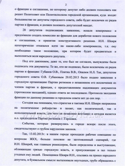 В завершении письма депутаты вспомнили о Викторе Януковиче. «Для того, чтобы на высоком качественном уровне провести выборы президента от Партии регионов В.Ф. Януковича в 2015 году, нам нужна слаженная работа единой команды, а не нагнетание агрессии в депутатском корпусе и в городе, чем и занимается Шкиря И.Н. и его помощники», - завершают они свое письмо.
