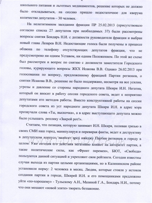 По мнению подписантов, «сегодня его действия (Игоря Шкири. – Ред.) негативно влияют на авторитет партии, а такие политические силы как «Фронт змин», БЮТ, Свобода пользуются данной ситуацией и укрепляют свои рейтинги».
