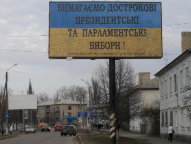 21 марта в центре г. Старобильск Луганской области был размещен бигборд с надписью на желто-голубом фоне: «Требуем досрочные президентские и парламентские выборы!». Об этом сообщил руководитель Луганского областного отделения гражданского движения «Спільна Справа» Владимир Винник, информирует пресс-служба движения.
