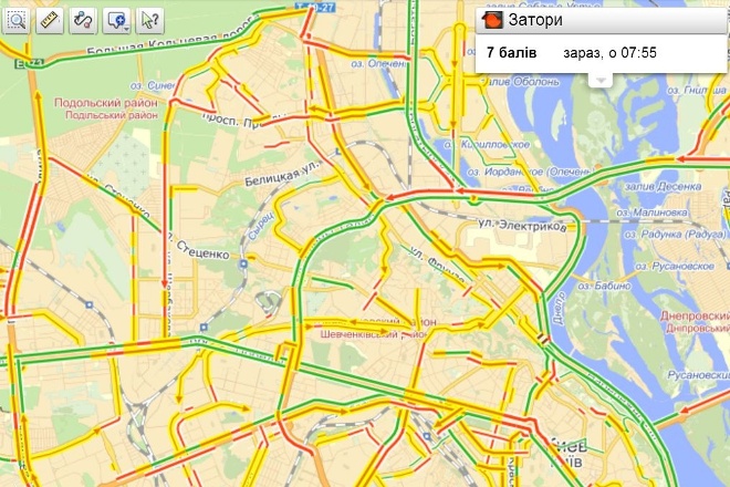 К 7:55 утра город, по данным Яндекс.Пробки, уже охватили 7-балльные заторы. Стоит практически весь центр, Подол, Троещина, невозможно проехать по ул. Дегтяревской, Вадима Гетьмана и Краснозвездному проспекту.
