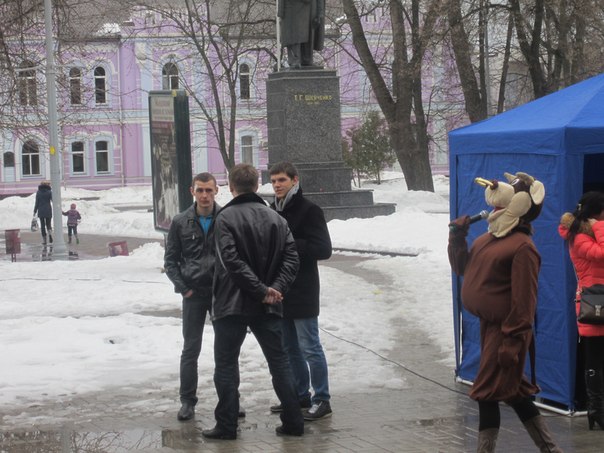 Сумская ячейка Партии регионов провела просветительскую акцию: сторонники регионалов оделись в костюмы коров и разгуливали по городу с партийной символикой.