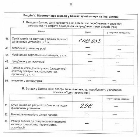 Кроме того, сократилось количество денег на банковских счетах сына президента. Если в 2011-м он задекларировал 1 млн153 тыс. грн, то год спустя сумма вкладов составила 1 млн 13 тыс. грн.