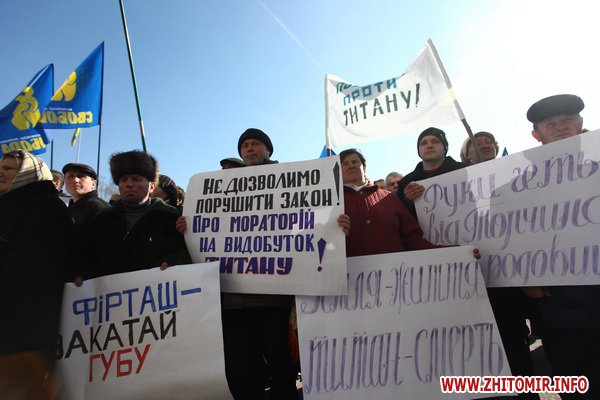 Более 200 человек протестуют против добычи титановых руд на территории Житомирской области. Люди стоят с плакатами: «Сохраним родное Полесье!», «Не дадим уничтожить родную землю!», «Титановой пустыне на Полесье – НЕТ!», «Фирташ – закатай губу», «В пустыне картошка не растет» и т.п.