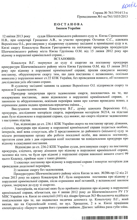 Шевченковский райсуд Киева удовлетворил иск Василия Ковальчука, касающийся его избиения сотрудниками «Беркута» во время акций протеста под Украинским домом в прошлом году.