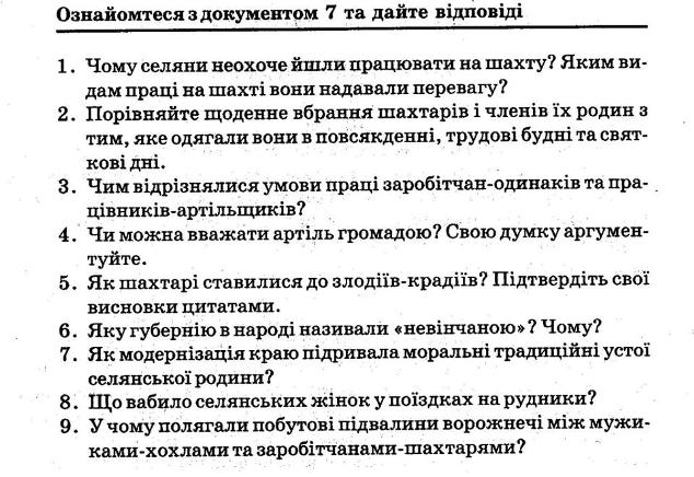 Далее подрастающим украинцам предлагается ответить на ряд вопросов. В частности, почему крестьяне неохотно шли на шахты, почему сельские женщины ехали на рудники, и почему мужики-хохлы враждовали с заробитчанами-шахтерами.