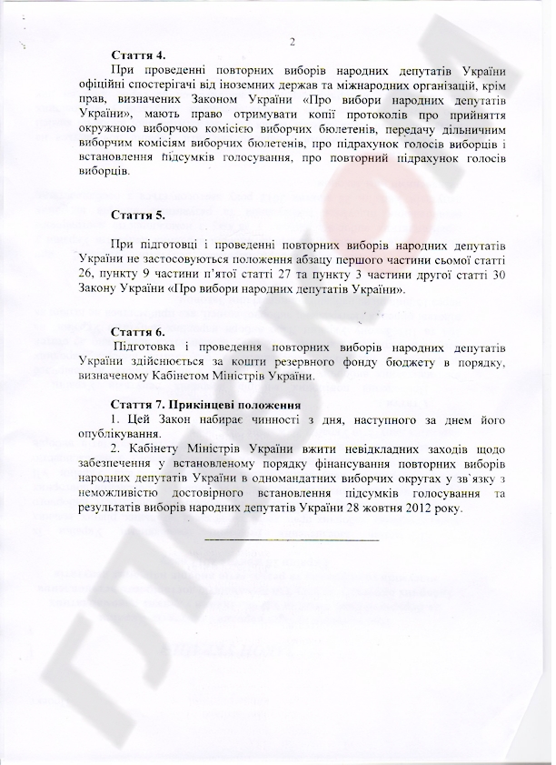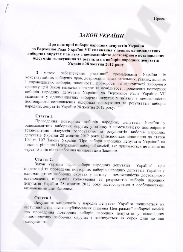 Согласно законопроекту, Верховная Рада для проведения выборов в пяти округах должна принять специальный закон разового применения. Называется он: «О повторных выборах народных депутатов Украины в Верховную Раду VII созыва в некоторых одномандатных избирательных округах в связи с невозможностью достоверного установления итогов голосования и результатов выборов народных депутатов Украины 28 октября 2012 года».