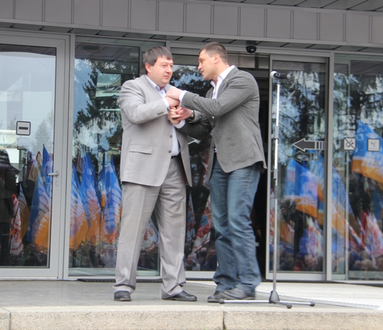 На улице в это время проходит митинг в поддержку действующего городского головы, во время которого состоялось столкновение между депутатами Александром Радуцким и Андреем Бильдой.