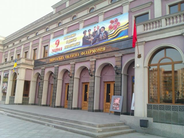 На здании Черкасской филармонии к 9 мая появился красный флаг, сообщает "Прочерк". Фотографию филармонии с флагом разместил на своей странице в социальной сети «Фейсбук» координатор Гражданской сети «Опора» в Черкасской области Николай Макуха.