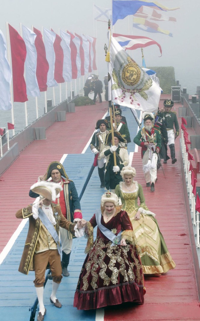 После парада в городе-герое на Приморском бульваре прошло театрализованное представление, героями которого в исполнении артистов Драматического театра флота имени Б.Лавренева и участников военно-исторических клубов стали личности, внесшие значительный вклад в 230-летнюю историю Черноморского флота.
