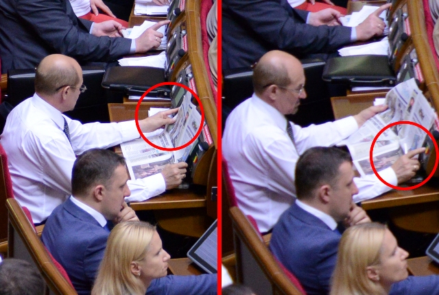 Кроме того, согласно информации Партии регионов, народный депутат Дмитрий Шлемко факт кнопкодавства попытался утаить, прикрывая пульт для голосования газетой. «Нардеп, расположившись на месте народного депутата Ярослава Федорчука, сначала голосует «за того парня», а затем уже - за самого себя», - сказано в документе.