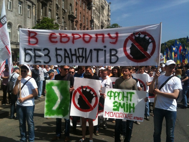 Впереди колонны идут лидеры трех оппозиционных сил – «Батькивщины», «Свободы» и «Удара».