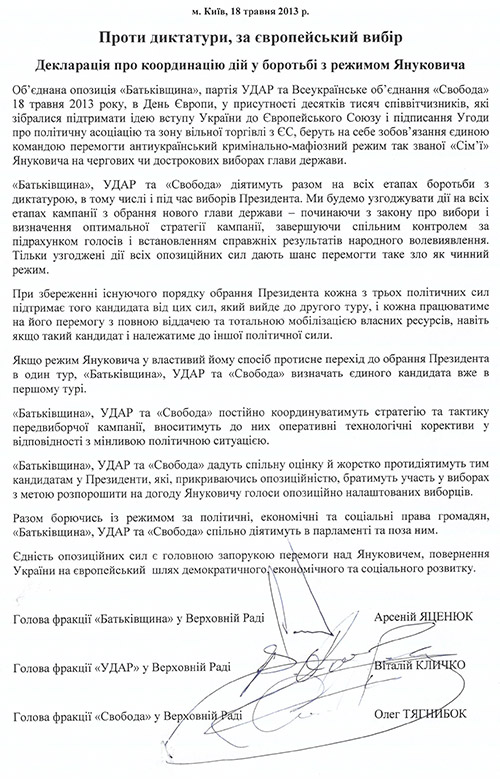 Как передает ЛІГАБізнесІнформ, в соответствии с декларацией, три политические силы – «Батькивщина», «Удар» и «Свобода» - обязуются единой командой победить «режим Семьи» на очередных или досрочных выборах президента Украины.
