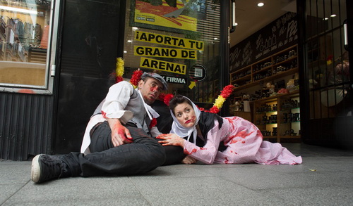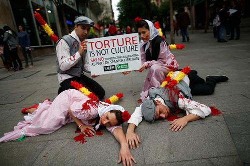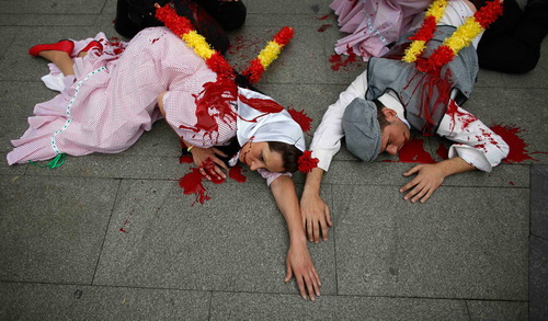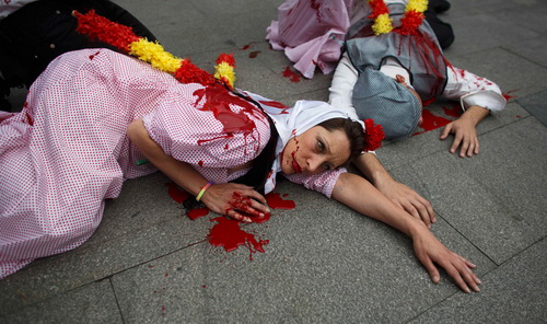 Борцы за права животных, одетые в традиционные костюмы и испачканные ненастоящей кровью, устроили лежачую акцию протеста против корриды в Мадриде. Другие участники перформанса держали над «трупами» соратников плакат с надписью: «Пытка – не элемент культуры. Скажи нет защите корриды, как части испанского наследия».