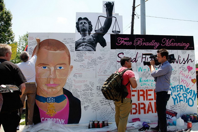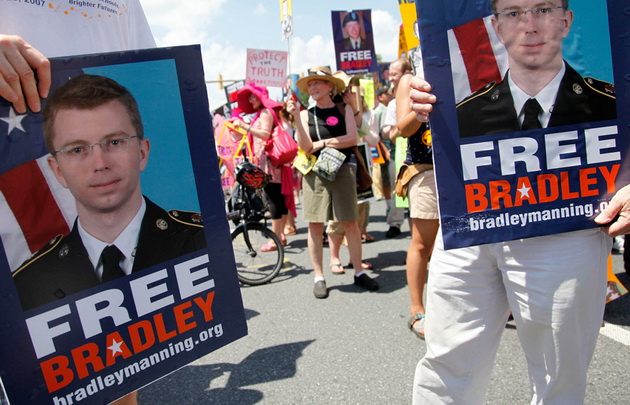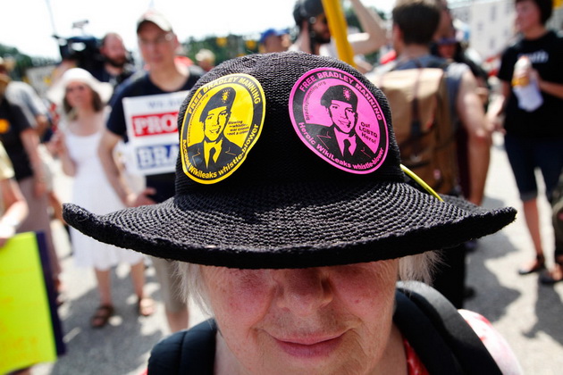 Сотни человек собрались в субботу на акцию протеста в городе Лаурел /штат Мэриленд/ в поддержку бывшего военнослужащего армии США Брэдли Мэннинга, которому инкриминируется передача сотен тысяч секретных дипломатических и военных документов интернет-порталу WikiLeaks.