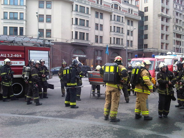 Людей, пытающихся сделать пересадку со станции «Театральная» на станцию «Охотный ряд», разворачивают обратно, в связи с чем в переходе скопилось большое количество людей. Эскалаторы не работают. Около станции стоит семь пожарных машин.