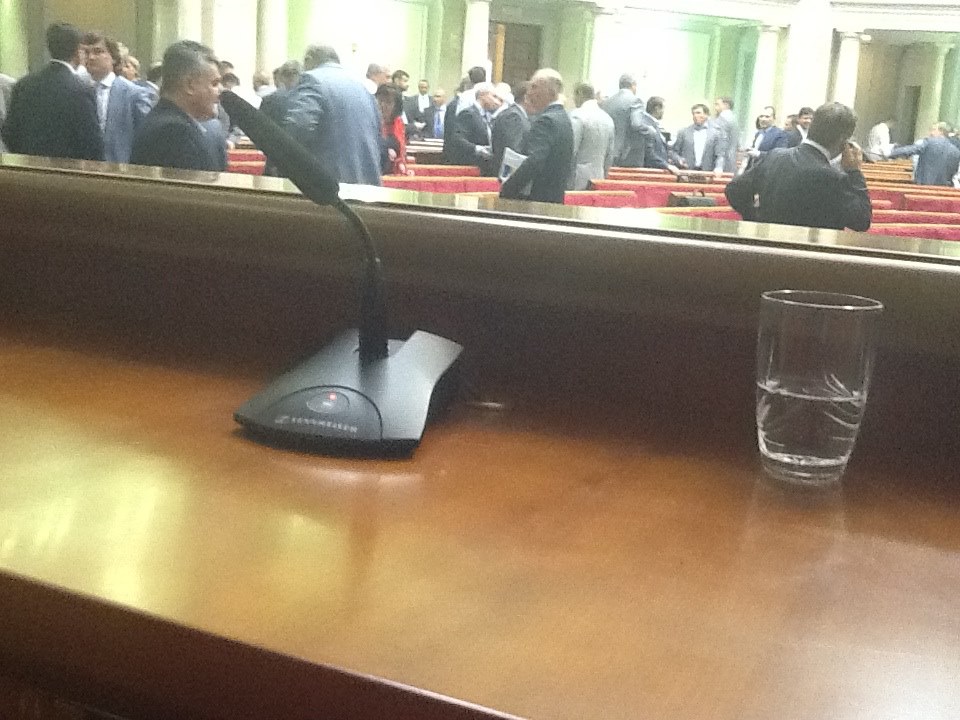 «Место, с которого Рыбак и Калетник пытались провести заседание ВР. На фото видно, что тут нет гнезд для голосования, хотя их карточки удивительным образом голосовали. Это два подтверждения не личного голосования руководства паралмента, то есть, принятые решения никчемны», - пишет Павловский.