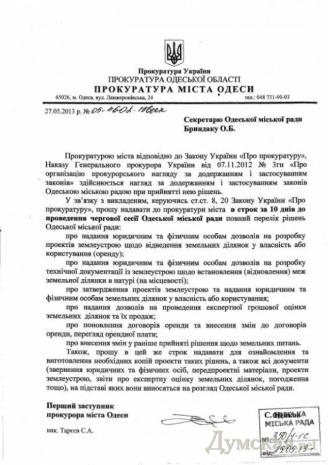По информации ряда СМИ, заместитель прокурора города потребовал от секретаря муниципального совета Олега Брындака за десять дней до сессий собрания информировать прокуратуру о всех земельных вопросах, которые планируют рассмотреть депутаты.