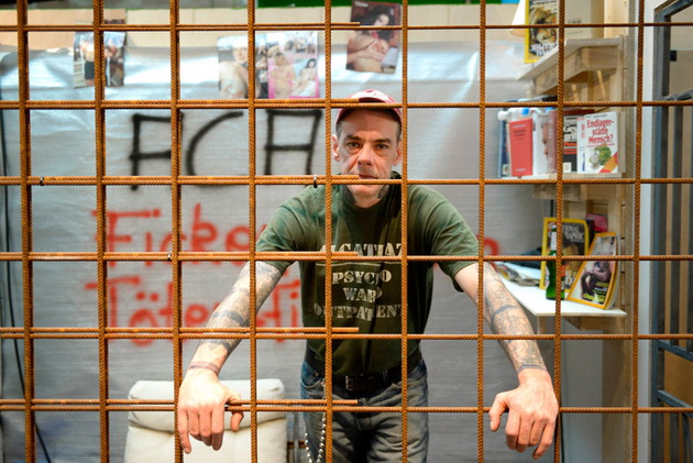 Современные художники творческого коллектива «Развлечение Всевышнего» представили в Гамбурге выставку-перформанс под названием «Человеческий зоопарк». В рамках проекта «нежелательные городские элементы» — панки, бывшие преступники и бомжи – наблюдают за посетителями выставки из клеток.