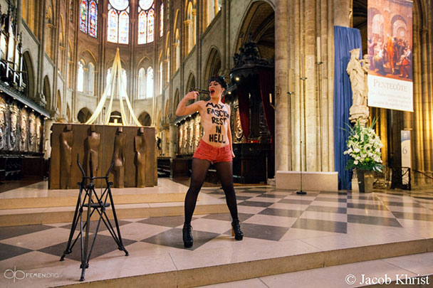 Активистки зародившегося в Украине движения FEMEN проводят топлес-акции по всему миру. В 2012 году движение было зарегистрировано во Франции. Недавно девушки организовали «перфоманс» в Соборе Парижской Богоматери, а также атаковали канцлера ФРГ Ангелу Меркель.