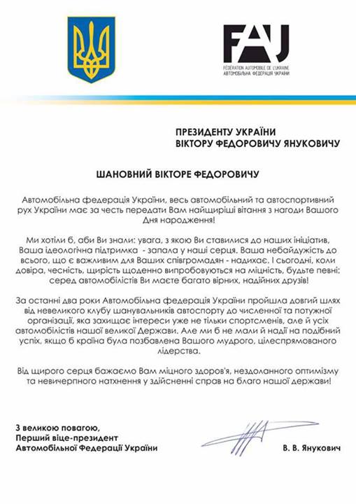 Сын президента Украины, народный депутат от Партии регионов Виктор Янукович как первый вице-президент Автомобильной Федерации Украины поздравил главу государства Виктора Януковича с днем рождения. Соответствующее поздравление он обнародовал на своей странице в Facebook.