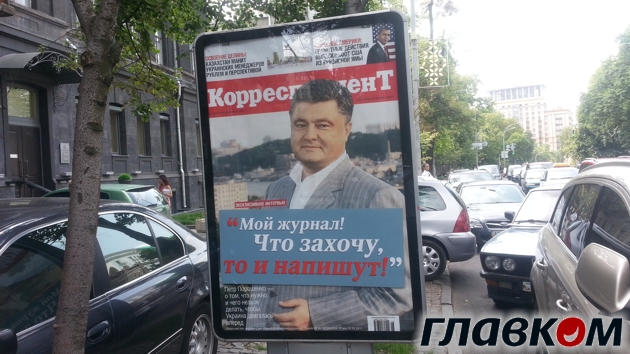 На носителях размещена обложка издания и изображением Петра Порошенко, интервью с которым опубликовано в свежем выпуске «Корреспондента». При этом заголовок материала, который является прямой цитатой героя номера заклеен и вместо него фирменным шрифтом «Корреспондента» в уста Порошенко вложены такие слова: «Мой журнал! Что захочу, то и напишут!».