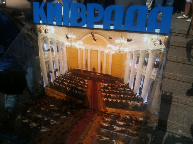 Участники утренней акции протеста под Киевским городским советом на одной из своих инсталляций сравнили депутатов горсовета с тараканами.