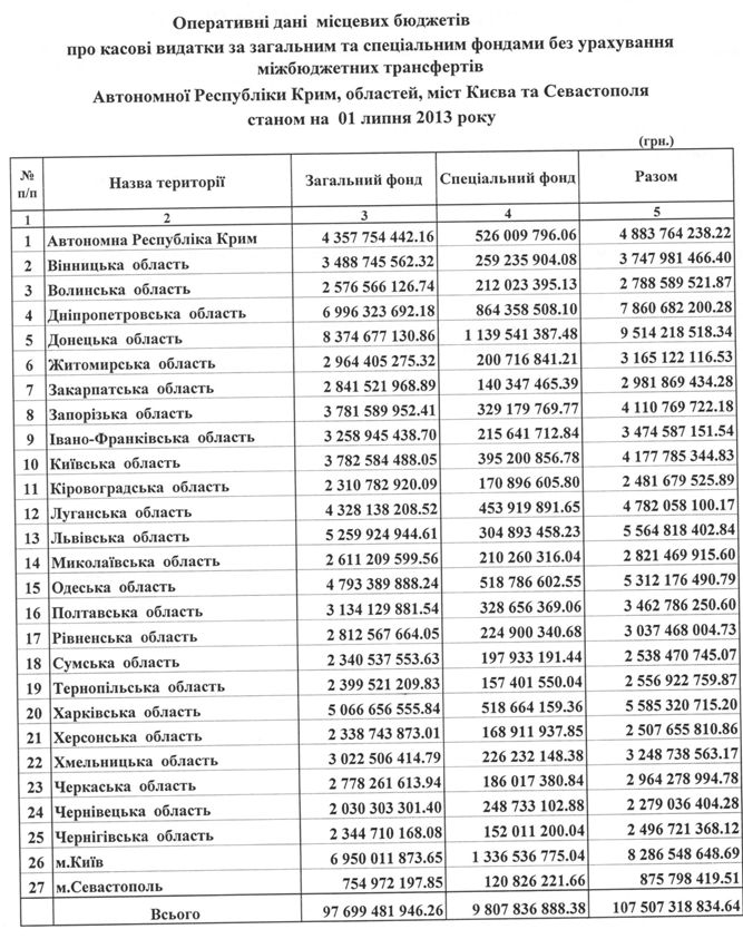 В ведомстве отмечают, что кассовые расходы местных бюджетов за 6 месяцев 2013 года (оперативные данные) составляли 107 млрд 507 млн грн и выросли по сравнению с аналогичным периодом 2012 года на 9 млрд 85 млн грн, или на 9,3%.