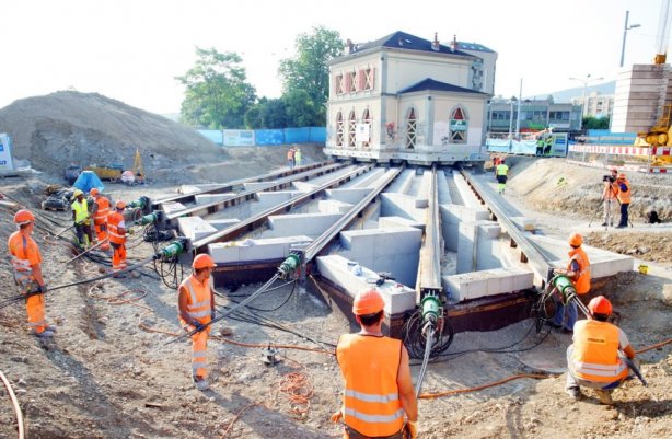 Чтобы не разрушать вокзал, построенный в конце 19-го века, с помощью рельсов и лебедки его переместили приблизительно на сорок метров.