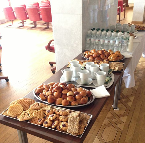 Сейчас прессу разместили в пресс-центре, где стоят столы с пирожками, сладостями и чаем.