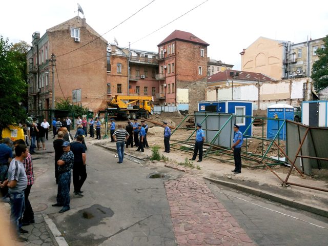 Сегодня в 8 утра несколько десятков киевлян заняли территорию строительства на Десятинному переулке 3-5 в Киеве. Активисты начали демонтаж забора и ликвидацию подкопа под соседние дома, пока их с территории не вытеснила милиция. Об этом сообщил координатор инициативы «Сохрани старый Киев» Игорь Луценко.