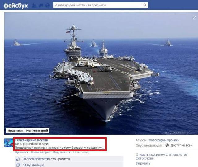В день российского ВМФ телеканал «Россия» поздравил всех причастных, проиллюстрировав свое поздравление американским авианосцем USS John C. Stennis CVN-74.
