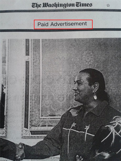 Материал о встрече президента Виктора Януковича с представителями племен индейцев размещен в американском издание под плашкой «реклама».