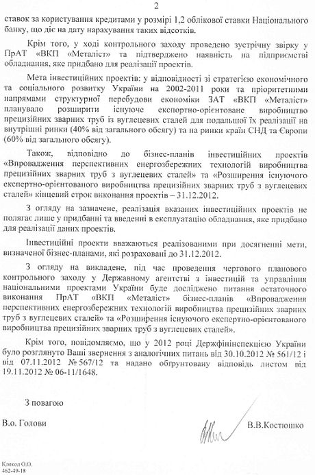 «Учитывая, что Ваше обращение не содержит новых доводов о нарушениях законности, а согласно письму Госфининспекции Украины от 02.07.2013 № 06-11.769 вопрос окончательного выполнения указанным обществом бизнес-планов будут исследованы во время очередного планового контрольного мероприятия, оснований для вмешательства органов прокуратуры, в том числе внесение сведений, свидетельствующих о совершении уголовного преступления в Единый реестр досудебных расследований, в настоящее время не усматривается», - написал заместитель генпрокурора Белоус.
