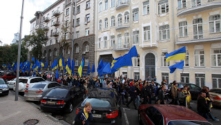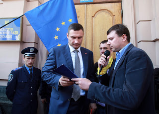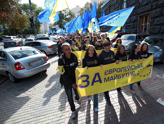 Впереди колонны участники акции несли баннеры с надписями «Євронаступ», «Європлан», символику ЕС и Украины, а также скандировали лозунги: «Украина – это Европа», «Украина! Права! Европа» и другие.