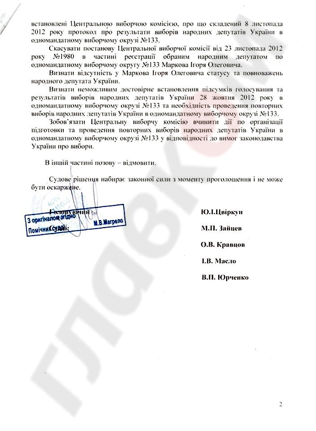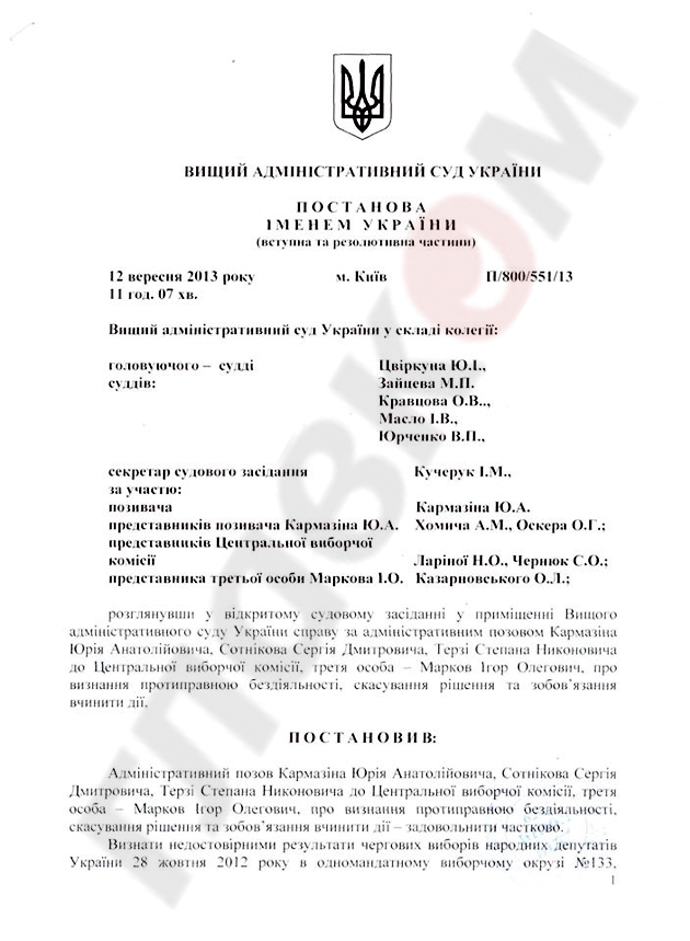 Бывший народный депутат Украины Юрий Кармазин опубликовал решение Высшего админсуда о лишении мандата народного депутата Игоря Маркова.