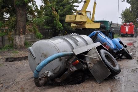 Автоцистерна провалилась в яму на проезжей части дороги, которую размыло в результате сильного ливня