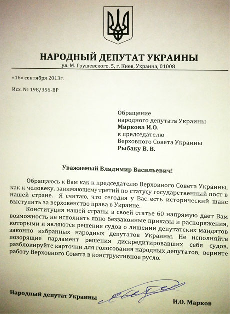 Игорь Марков, которого судом лишили депутатского мандата, призывает спикера Владимира Рыбака не выполнять решение суда. Об этом говорится в обращении Маркова, распространенном в понедельник.